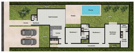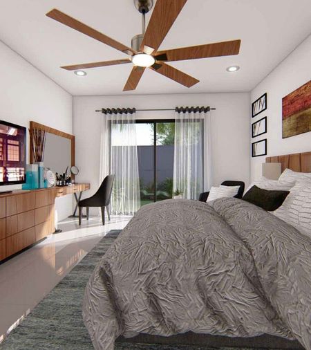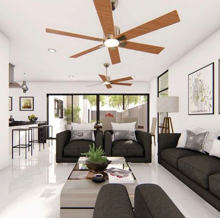 Salidas para ventiladores de techo en recámaras, sala, comedor. Construcción con refuerzo para segundo piso, a excepción de la cochera. Espacios en áreas verdes en frente y patio de la casa: 117.5 m2.