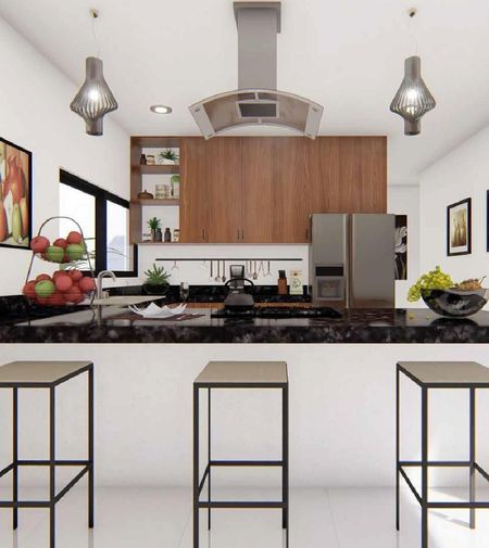 Piso cerámico de primera calidad de 90 x 45 cm. Cancelaría en ventanas de aluminio color bronce (Negro). Meseta de granito (Negro) en cocina.