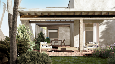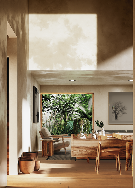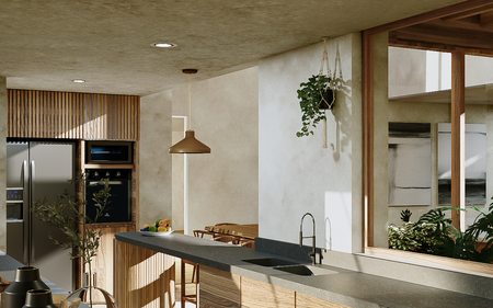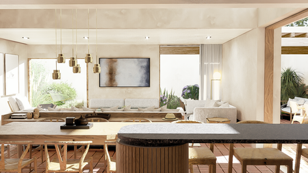 Entrando por el vestíbulo a doble altura la casa se abre al espacio social; un gran diseño de sala/comedor con vistas a la agradable terraza, a los que da servicio la amplísima cocina de bastante almacenamiento y más que suficiente espacio de preparación.