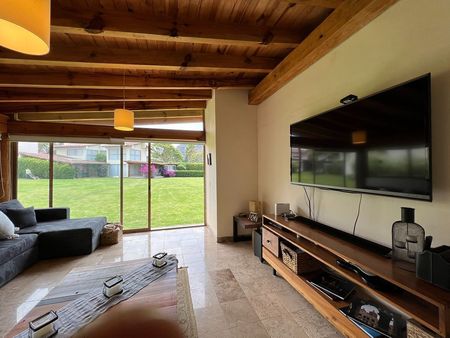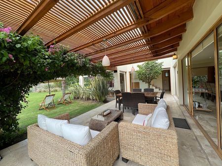 El jardín de la casa es exquisito y bien cuidado, con una hermosa bugambilia que adorna la terraza. A través del jardín, se puede acceder a un cuarto de televisión adicional, perfecto para momentos de entretenimiento, o puede fungir como una cuarta recámara ya que tiene su baño completo.