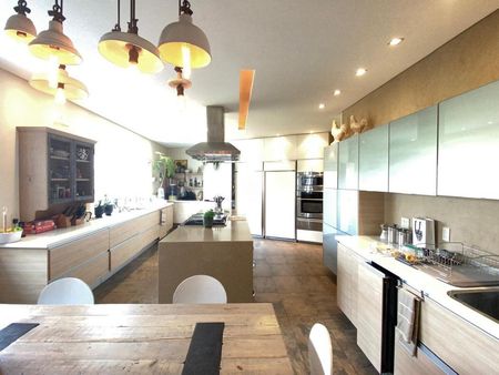 Espacioso comedor con acceso a una enorme y funcional cocina con equipo profesional y desayunador.