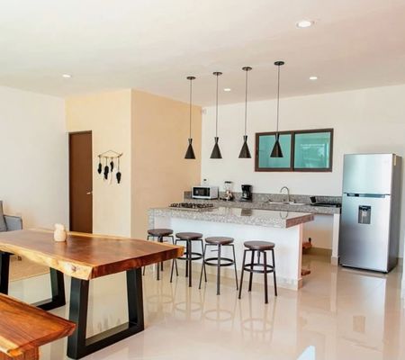 *Cocina : estufa, refrigerador, cafetera, microondas y utensilios con barra desayunadora