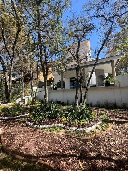 con espacio para edificar cochera para 6 autos techados y salón de juegos. actualmente es un jardín de diseño orgánico con plantas de ornato y paisajismo increíble. Terraza con área de asador y chimenea, área arbolada en la parte trasera de la casa.