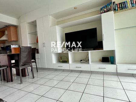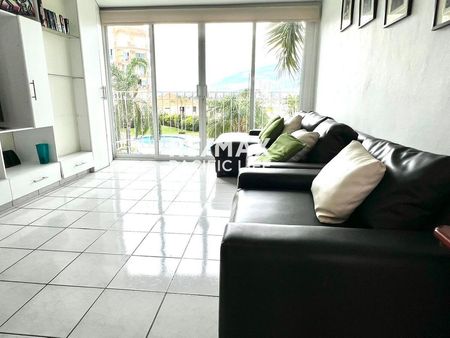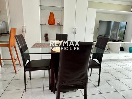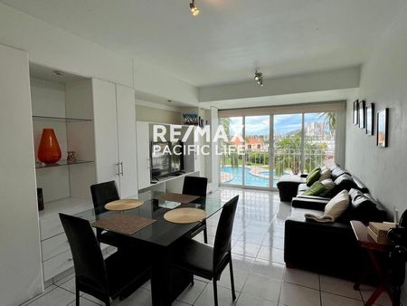 El departamento incluye aire acondicionado, cocina equipada, área de sala con vista hacia las albercas y jardines del complejo, así como internet y mantenimiento incluidos en la renta.
