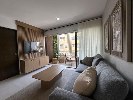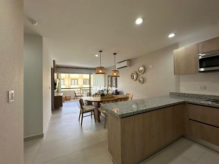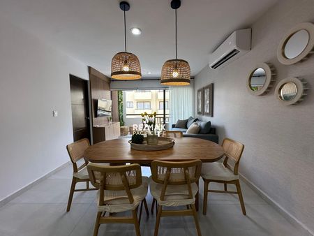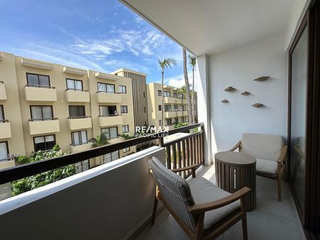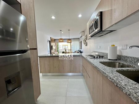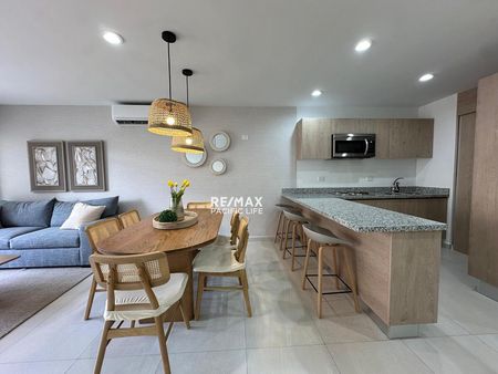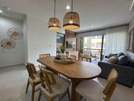 El condominio está completamente amueblado con un estilo fresco y de playa, listo para