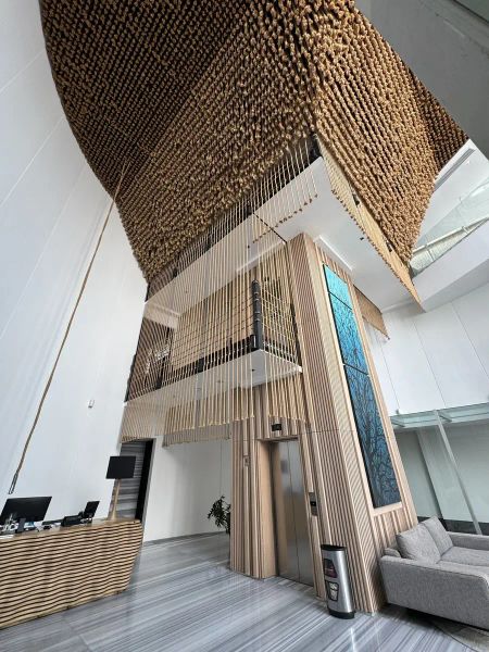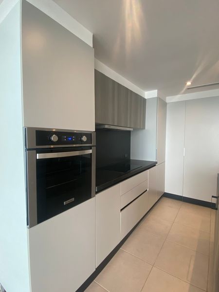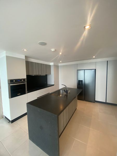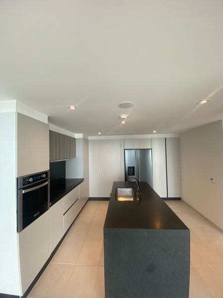 - Cocina integral con vista al mar equipada con isla de cuarzo, parrilla, campana, torre de hornos, doble tarja