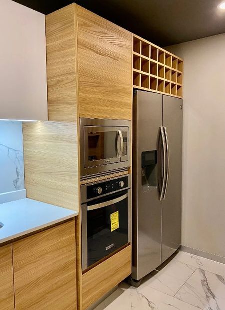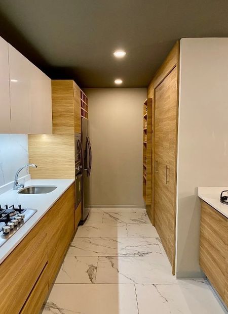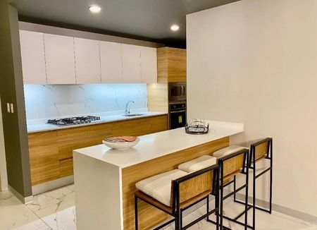 Acabados de lujo que incluye una cocina tipo europea que se entrega con horno de microondas y opción de lugar para vinos y especiero de madera, pisos en madera de ingeniería y porcelanato tipo mármol.
