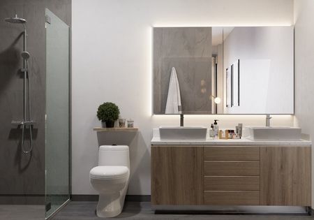 • Cancel fijo de cristal templado de 10 mm a 1.80 m de altura en regaderas y puerta abatible de cristal templado de 10 mm