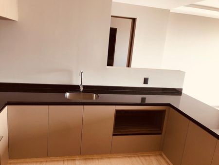 • Cocina integral con finos acabados, cubierta de granito, gabinetes en tonos madera y espacio funcional.