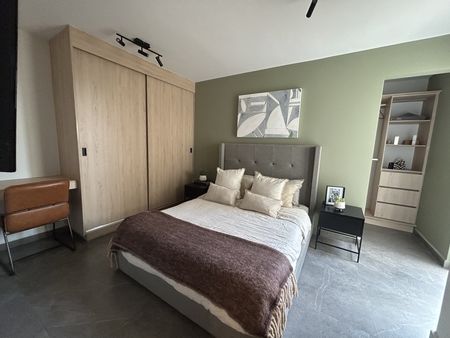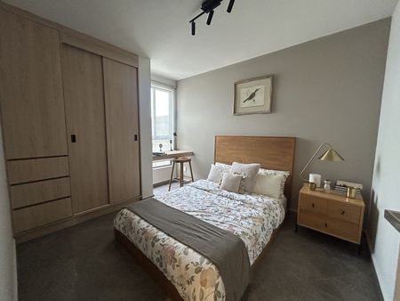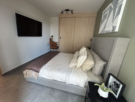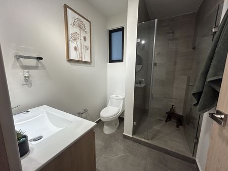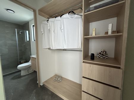 Cuenta con 2 habitaciones, la principal con walking closet y closet cerrado, baño completo. La secundaria con closet, estancia, baño completo que da servicio a la recámara secundaria y visitas, cuarto de lavado, cocina equipada.