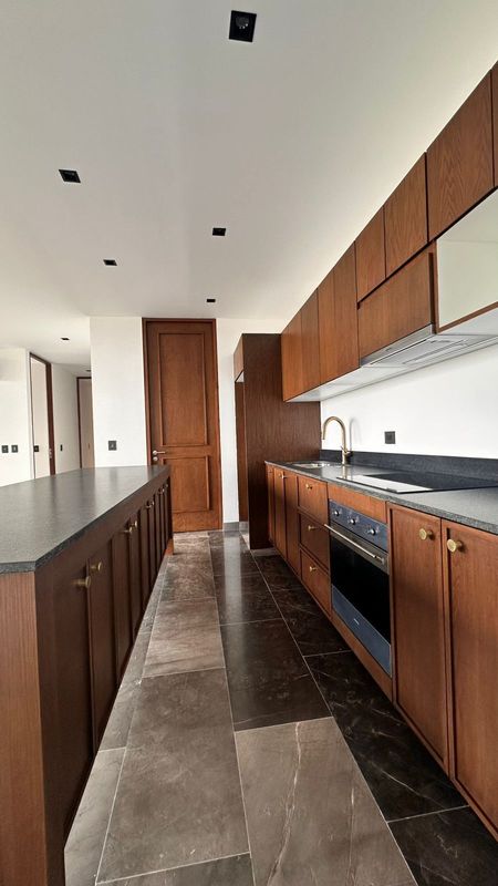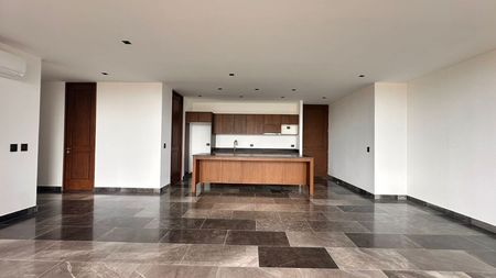 Amplia e iluminada área de sala y comedor con terraza y vista espectacular, cocina abierta con barra en acabados de fino granito y carpintería de excelente calidad.