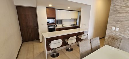 Estancia sala-comedor con ventanal de acceso al amplio balcón y generosa iluminación natural, cocina integral equipada con barra de granito, área de lavado integrada, pasillo, medio baño para visitas, baño para las 2 recámaras junior, recámara principal con walk in closet y baño, piso laminado, cancel en cocina y cancel de vidrio templado en baños, persianas black out en recámaras.