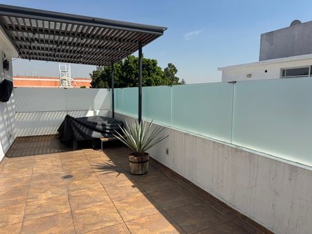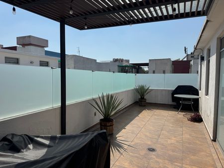 Planta alta: se encuentra una recámara, un baño completo, un area de lavado, una escalera que comunica con la planta baja del departamento y una terraza de 29.90 m2