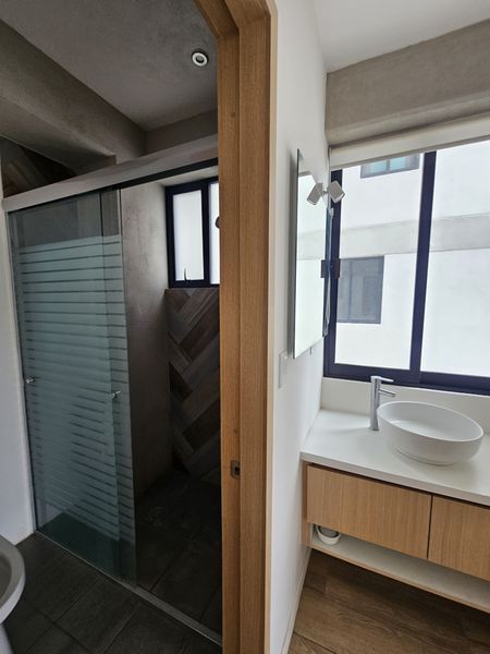 Sala, comedor con balcón, cocina Integral, 2 recámaras , 2 baños completos, espacio para área de lavado, estacionamiento para 2 autos techado.