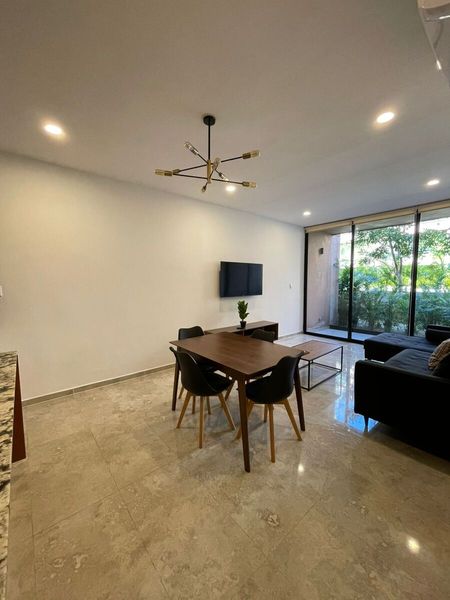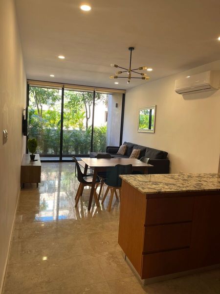 Departamento amueblado en venta, en planta baja, en un complejo de departamentos ubicado en Temozon Norte