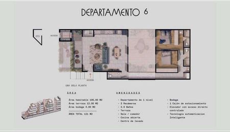 Superficie total: 121.00 m² (105 m² interiores + 12 m² de terraza + 4 m² de bodega).