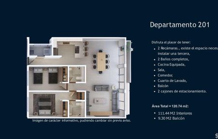 Distribución: 111.44 m² de interiores y 9.30 m² de balcón.