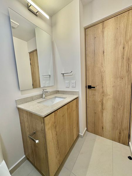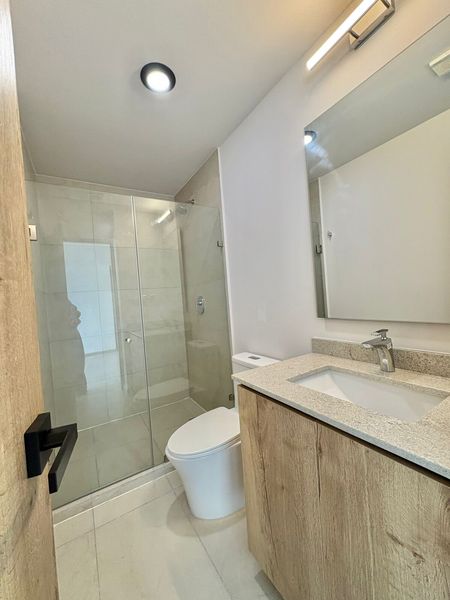 Se encuentra en el piso 5, tiene dos recamaras, cada una con aire acondicionado, la principal con closet muy amplio, un baño completo, cocina con cubierta de cuarzo blanco, sala comedor con aire acondicionado, área de lavado y cochera para un auto.
