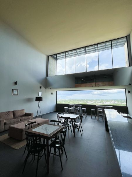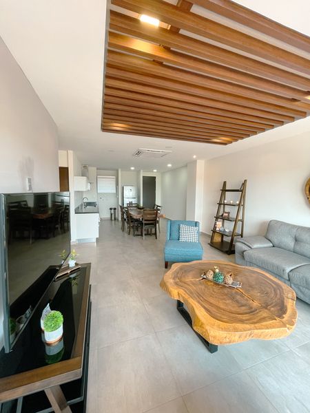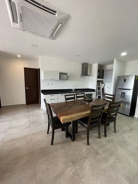 Sala comedor y cocina en una misma área, con vista panorámica desde la sala.