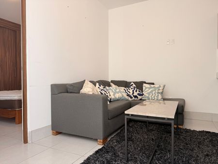 Cuenta con cocina integral con barra y bancos, Sala con mesa de apoyo, Recamara con clóset, Baño Completo y Aire acondicionado. El departamento es de estilo moderno muy iluminado.