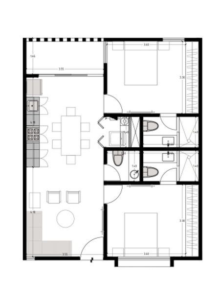 - 2 Recámaras con baño completo c/u y espacio para clóset lineal c/u