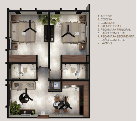 Acceso, cocina, comedor, sala de estar, recámara principal con baño completo, recámara secundaria con baño completo, área de lavado