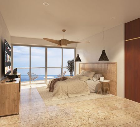 Recamara principal con closet vestidor, baño y terraza con vista al mar