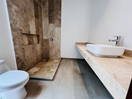 1 recámara con baño completo con meseta de mármol, lavabo de sobreponer e inodoro de una pieza