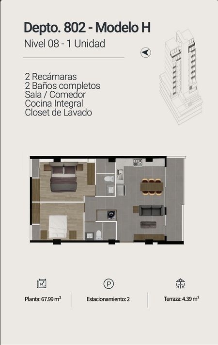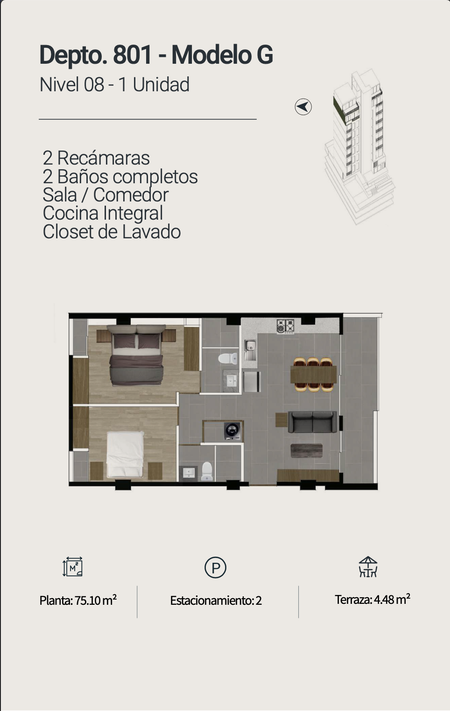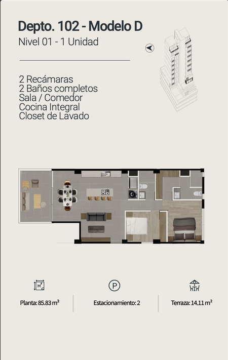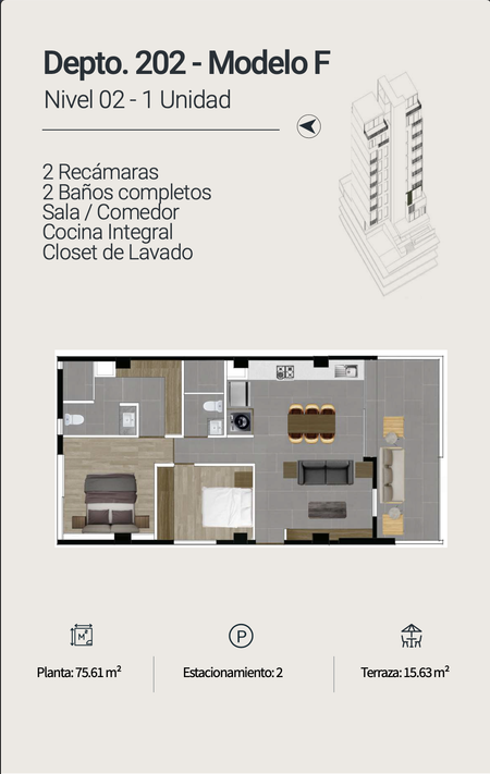 * Departamentos de 2 recámaras con 2 baños completos, sala-comedor y áreas de lavado inteligentes.