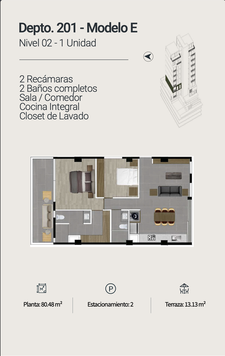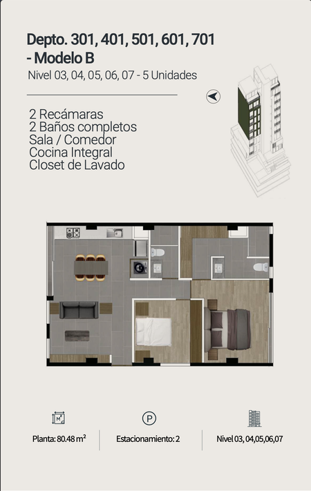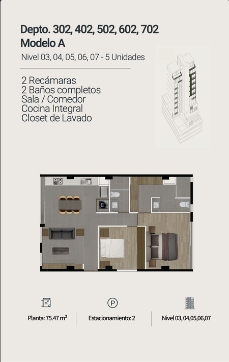 El desarrollo ofrece una variedad de modelos distribuidos en distintos niveles, con opciones que van desde 1 hasta 2 recámaras, todas con acabados de alta calidad y diseño funcional: