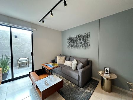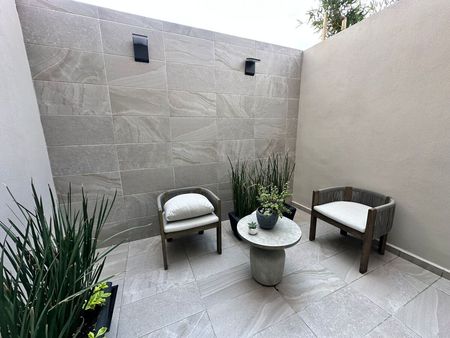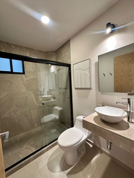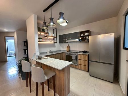 Sala, Comedor, cocina Integral con cubierta de granito,area de lavado, 2 recamaras la principal con baño completo, Roof Top estancia, 3 baños completos, estacionamiento 2 autos.