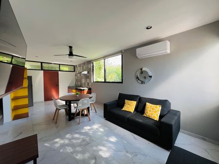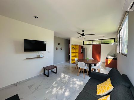 - Sala con smart tv y comedor para 4 personas con aire acondicionado y ventilador