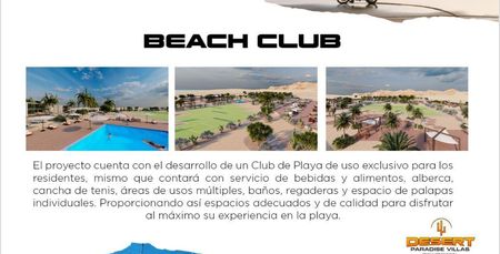 Desert Paradise Villas es un exclusivo proyecto creado para brindar a las familias y visitantes un espacio de relajación en la playa, con amenidades para la convivencia familiar y actividades al aire libre y de off-road. Materializando la visión de Don Fernando, el dueño original del predio, quien soñaba con un lugar donde su familia pudiera adquirir recuerdos y disfrutar de tiempo de calidad con todas las comodidades y amenidades como playa, club de playa y pista off-road.