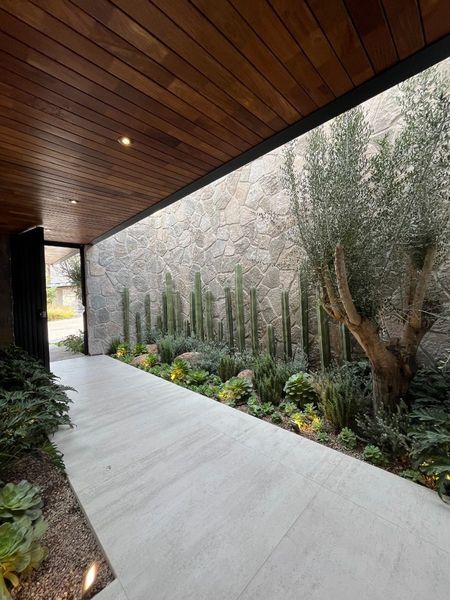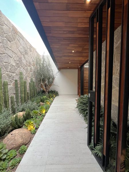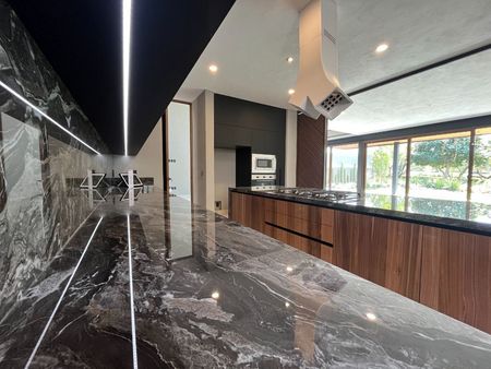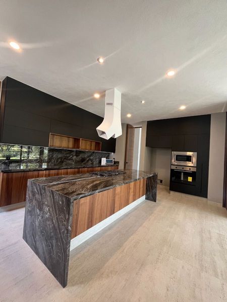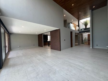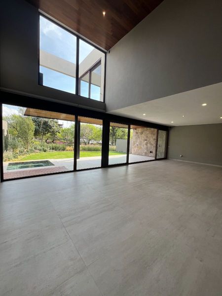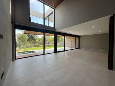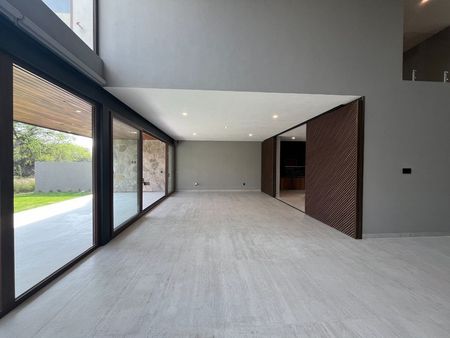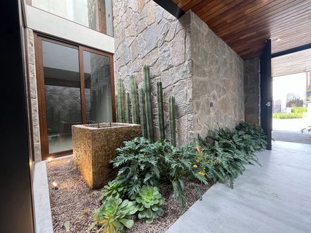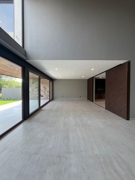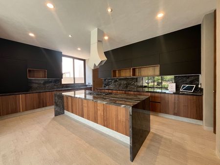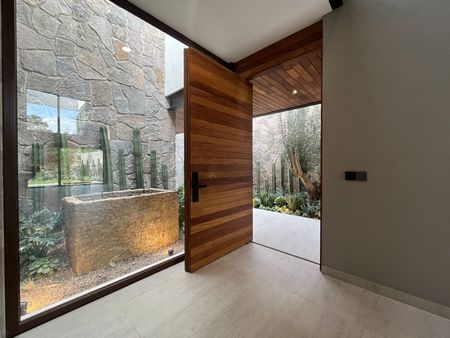 En la planta baja, se encuentra un jardín interior y una fuente que da acceso al vestíbulo principal. También hay un estudio o 4ta recámara, con clóset y baño completo, así como un medio baño para el área social. La sala y el comedor cuentan con doble altura en el techo, forrado de nogal americano. La lujosa cocina está totalmente equipada y conectada a la estancia principal, que da a una terraza techada y un jardín de buen tamaño, colindante con un área verde. Además, hay un jacuzzi, pisos de porcelanato de gran formato y una escalera de encino con barandal de vidrio templado.