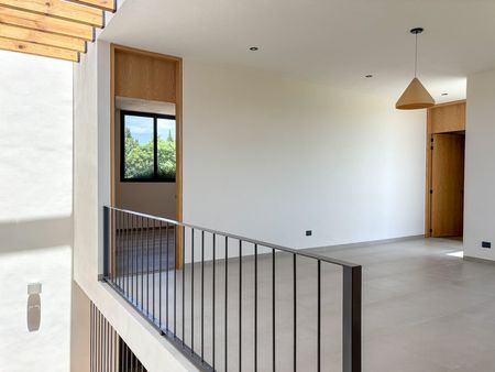 La entrada vestibulada deja entrever la vegetación del jardín a través de una elegante celosía que divide la entrada a un estudio independiente en planta baja con baño completo y marca el acceso a la casa a partir del cual se abre un amplísimo espacio de recibimiento en el que fluye el área social: estancia, cocina abierta y salida a la terraza y jardín. Sus generosas alturas y entradas de luz natural la convierten en una casa muy atractiva. Atravesando la cocina de gran espacio de almacenamiento y acabados de primera está el cuarto de lavado con acceso independiente y tras este, el cuarto de servicio con baño completo.