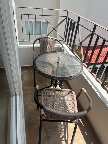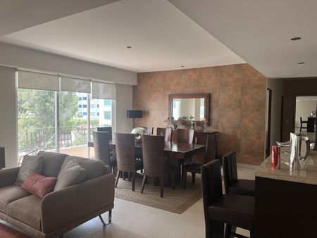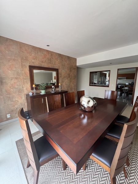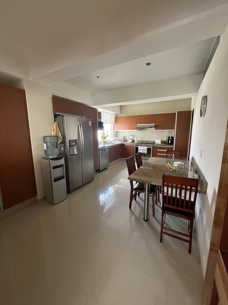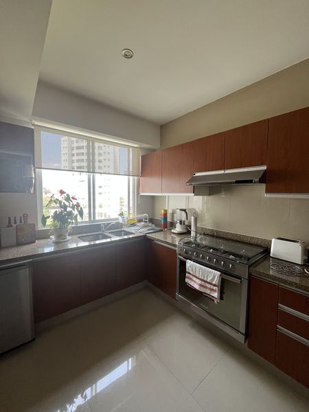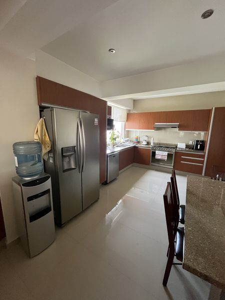 Recibidor de muy buen tamaño, baño de visitas, sala comedor, con salida al balcón y vistas arboladas, amplia, cocina equipada, con desayunador, cuenta con mucho espacio de guardado y despensa, área de lavado y cuarto de servicio con baño completo.