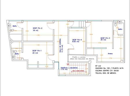 Espacio en planta alta de pequeña plaza comercial con 4 lugares para oficina, consultorio, aulas, etc. cada uno con baño, ubicación privilegiada dentro del primer cuadro de la ciudad de Toluca a 30 mts de la calle de Morelos.
