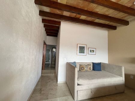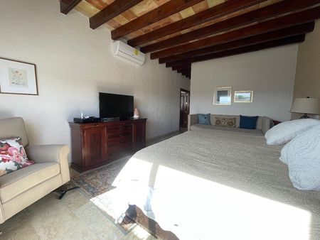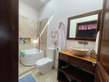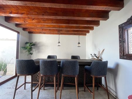 En Planta Baja, nos recibe el área de sala-comedor muy amplia, con doble altura y vigas de madera se integra totalmente con un pequeño jardín, mismo que tiene riego por aspersión, la cocina equipada con barra desayunador de granito, parrilla magnética, hornos, alacena y toda la carpintería con cierre lento. Área de TV o Bar, con duela de madera y medio baño de visitas. El área de lavado techada, patio de tendido y cuarto de servicio. Cochera techada para 2 autos.