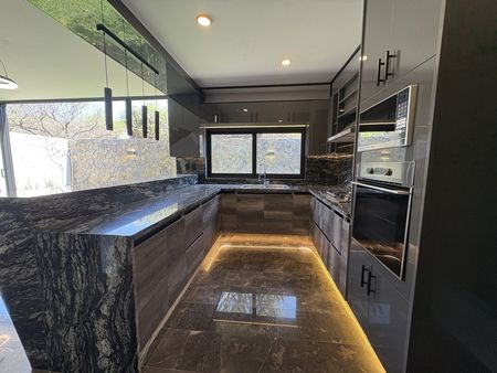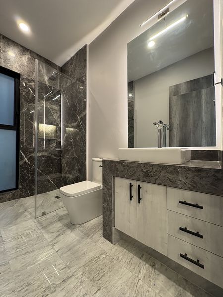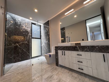 Casa con acabados en mármol en cubiertas, pisos, baños