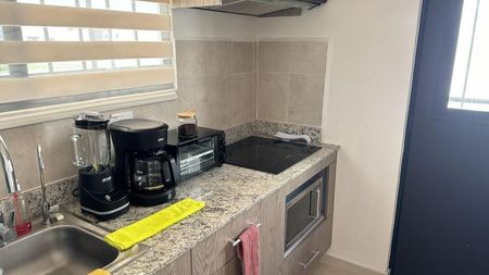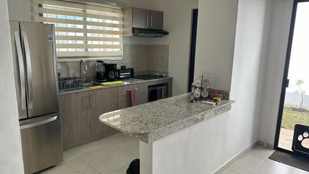 Cocina totalmente equipada: alacenas, refrigerador ,dispensador de agua fría y máquina de hielos , potabilizadora de agua para refrigerador y toma de agua potable en cocina , estufa de inducción , licuadora , cafetera , horno eléctrico pequeño , horno de microondas grande , platos vasos , cubiertos , utensilios de cocina.