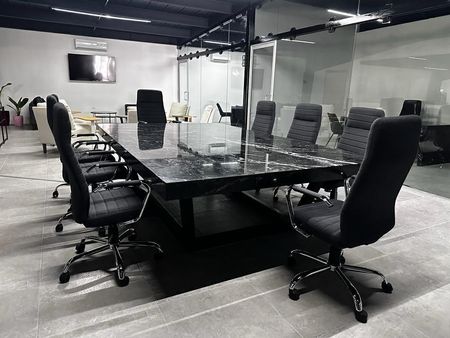 Mobiliario con escritorios de mármol y sillas ergonómicas