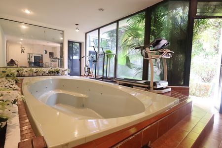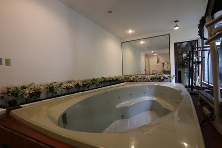 En planta baja tiene sala y comedor con vista a un hermoso jardín interno, cocina equipada y baño de visitas, de la cocina tiene salida a un jardín interno que nos lleva a un salón que tiene un jacuzzi para 15 personas y un pequeño bar, además cuenta con un baño completo que da servicio a esta área.