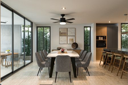 La parte trasera de la casa se abre con una vista ortogonal que deja entrar la naturaleza y el sol. En ella destacan una **sala de doble altura**, un amplio comedor y la **recámara principal flotante** en planta alta, que crea una espectacular terraza con acceso directo a la alberca privada.