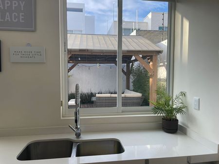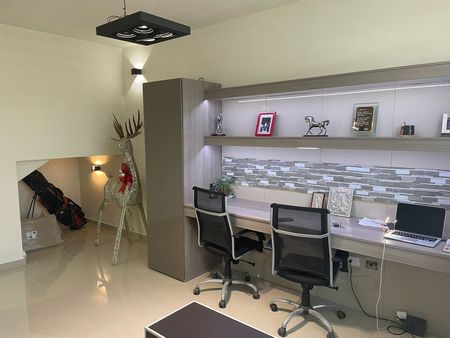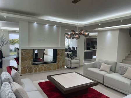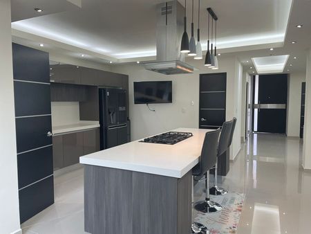 En planta baja tenemos un estudio, medio baño de visitas, sala, comedor, una hermosa chimenea que los separa, guardarropa, cocina integral con cubierta de granito y con isla, amplia despensa, jardín con pérgola, todos los pisos son de porcelanato de 60x60
