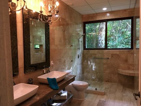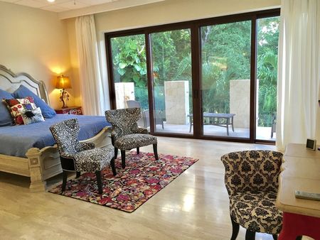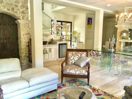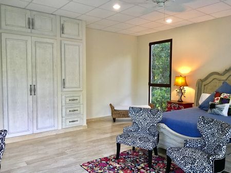 Cada habitación cuenta con camastros y muebles para exterior en el balcón. El área con parrilla es ideal para comer afuera. Los jardines que rodean la propiedad se mantienen en perfecto estado por medio de riego por aspersión e iluminación ambiental en los árboles para ambientar por las noches. El jardín junto a ambas casas cuenta con árboles y una acera desde la entrada de las dos casas. La entrada a este jardín comienza en la entrada con una puerta de hierro forjado importada de Puebla, con un camino de piedras que llevan hasta la zona de la alberca. La casa grande cuenta con una distribución abierta. La sala, comedor, cocina y bar están abiertas y dan al exterior a través de grandes ventanales. La cocina gourmet cuenta con barras de cuarzo, un horno de convección profesional, microondas grande con horno de convección, alacenas a la medida, refrigerador de puertas dobles con congelador de cajón en acero inoxidable, lavadero con extractor y lavaplatos. Disfrute una bebida en el bar con amigos con repisas de cristal, refrigerador y lavadero de cobre.