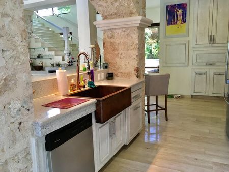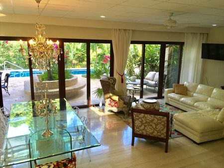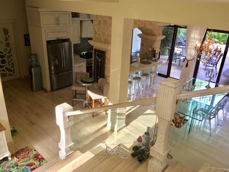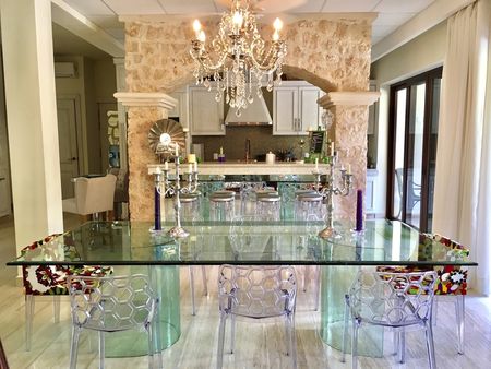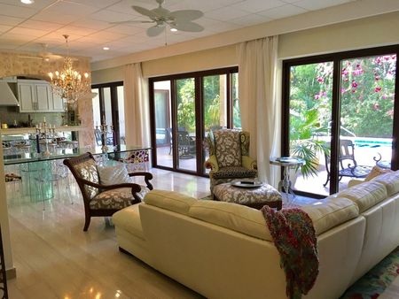 Ubicado dentro de Bahía Príncipe Golf Residences, frente al fairway del hoyo 7. Bahía Príncipe fue diseñado por el famoso diseñador de campos de golf Robert Trent Jones II. Esta propiedad consiste de dos villas de lujo llamadas Villa de Golf. La casa principal cuenta con 526 m2 de construcción, mientras que la segunda casa cuenta con 232 m2. Ambas casas han sido decoradas profesionalmente, completamente amuebladas con todas las amenidades y comodidades que desea. Ambas villas cuentan con aires acondicionados, ventiladores, techos de doble altura, closets y alacenas a la medida, candelabros, tapetes de la marca Company C, muebles de lujo, sistema para ablandas el agua por toda la casa. Las dos albercas de mosaico veneciano están unidas por un puente y quiosco, ambas se calientan a la temperatura que usted desee para disfrutarlas todo el año. El quiosco que conecta las albercas cuenta con una cascada de 1 metro de ancho que tiene una caída de 3 metros por ambos lados. La ambientación por la noche se ve resaltada por las 3 fuentes con iluminación LED.