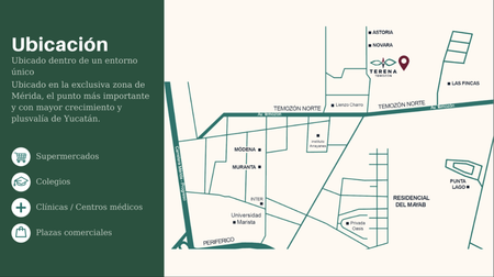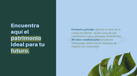 Exclusiva privada ubicada al norte de la ciudad de Mérida , en una zona de alto crecimiento y gran plusvalía , formada por 49 lotes residenciales totalmente urbanizados dentro de un esquema de régimen de condominio.