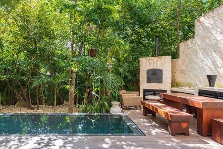 Este hermoso departamento se abre a una hermosa terraza con jardín en la selva con alberca, camastros, ducha al aire libre para dos, parrilla al aire libre y horno de pizza italiano. Los jardines están muy bien cuidados con palmeras, vegetación tópical y árboles. También hay un bonito garaje para dos coches.