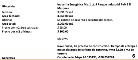 meses después de la firma de contrato. Mtto $2.20 x m2 de