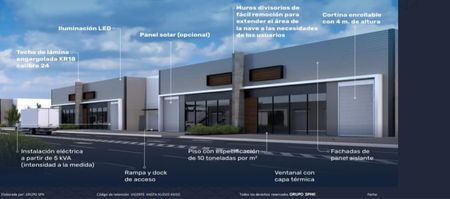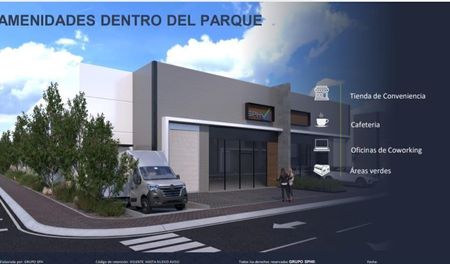 Descuento de pago de contado y financiamiento por parte de la empresa y con la opción de administración y renta asegurada por un año. Ideal para inversión ya que tenemos planes de financiamiento dónde la bodega se va pagando sola. 6 hectáreas • 60 naves desde 500m2 a 800m2, pero se pueden unir y hacer una superficie mayor en base a necesidades cliente Servicios adicionales en el parque: • Cafetería • Gimnasio • Farmacia • Guardería • Área de descanso Plumas automáticas Vigilancia y monitoreo 24/7 Cámaras y grabación Fotoceldas Fachadas de concreto • Panel aislante • Ventanal con capa térmica • Rampa niveladora • Canalones de acero inoxidable Tratamiento de aguas residuales • Infraestructura para instalación de altas cargas eléctricas • Reservas de agua para abasto continuo • Integración de áreas verdes • Altura libre de 7 mts • Rampa niveladora de 13 toneladas de resistencia • Piso con especificación de 10 toneladas por metro cuadrado • Una rampa y un dock de acceso a la bodega • Altura de 5mts de la cortina enrollable • Instalación eléctrica hasta 10Kva • Techo de lámina engargolada KR18 cal. 24 • Muros divisorios de monoblock a 2mts y Tablaroca al techo • Tres opciones de oficinas (no incluido en el precio por bodega.